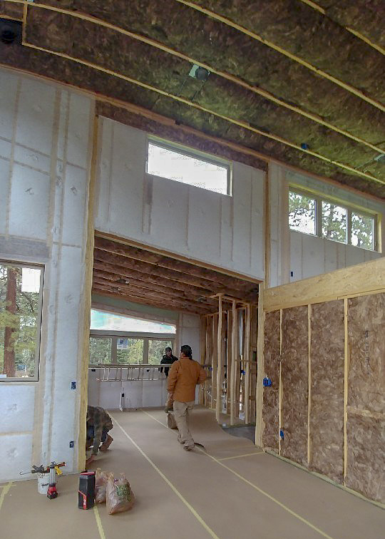 Advanced Framing Techniques were utilized in multiple places for either material conservation or better thermal performance.  The 2 story section of the home was built out of continuous engineered lumber on 2’ O.C. spacing. This allows for straight tall walls to be built quicker with less lumber.  The loft floor system was then built to the inside of the tall walls to allow for continuous floor to ceiling insulation in the walls. Raised heel parallel chord trusses allowed for extra thick insulation to be installed in the attic spaces and over exterior walls.  2’ O.C. spaced studs and two stud corners reduce lumber usage and also allow for the trusses to bear directly on top of the framing.