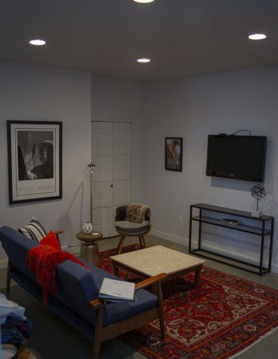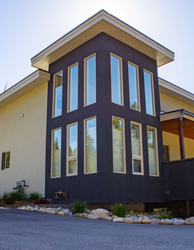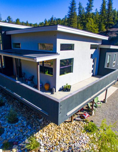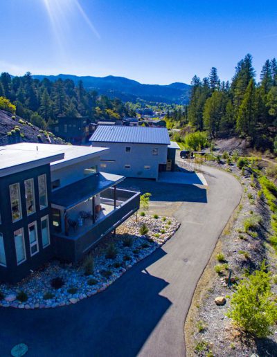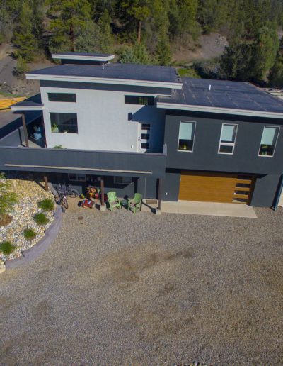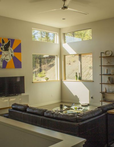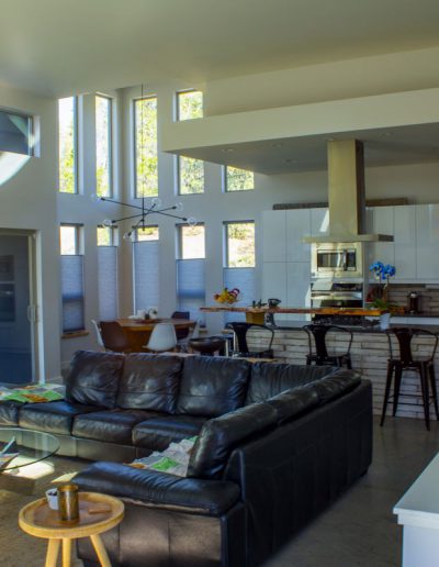 The nearly 14’ foot high ceilings in the dining room and 12’ ceilings in the living room make the home feel open and airy.  Sleek glossy white cabinetry mixed with rustic tile backsplash, quartz countertops, and a locally harvested live edge pine bar create an interesting mash up of materials in the kitchen.  The spacious open floor plan was designed to allow defined flow between the spaces without any hallways and is perfect for entertaining no matter the size of the party. Low maintenance landscaping was chosen to reduce water usage and create an environment that mixes well with the arid high desert native plants surrounding the area.